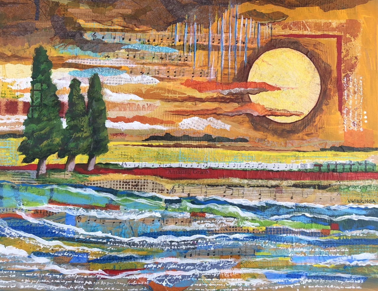This mixed media collage was commissioned by a woman who has traveled through many medical challenges but still can sing “it is well with my soul”. The music of some of her favorite hymns is embedded into the earth, sea and sky.